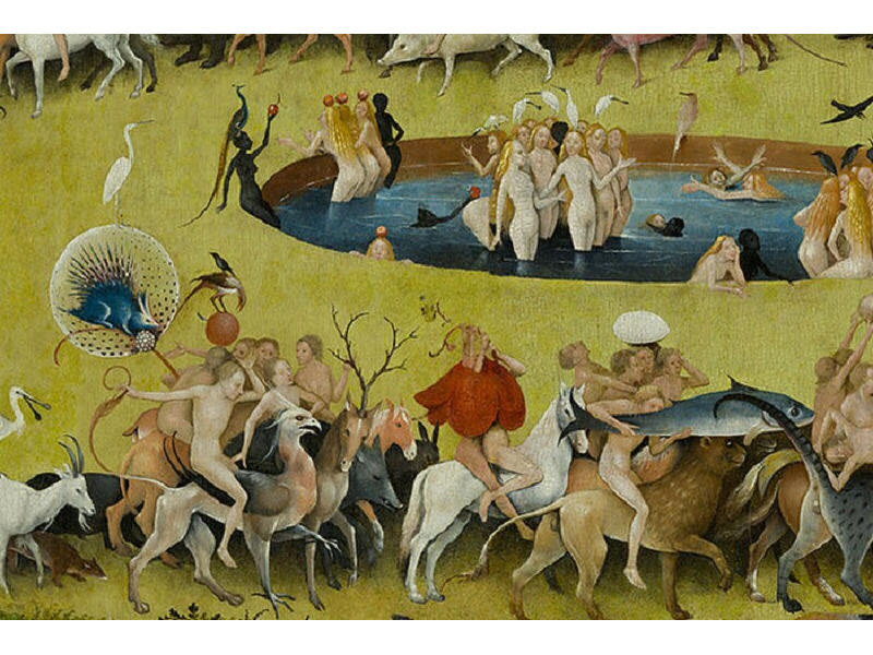 Голландское слово "vogel", что в переводе значит "птица", в устаревшем знании переводилось как "половой акт". Босх заполонил пернатыми всё полотно, демонстрируя таким образом склонность человека к разврату.